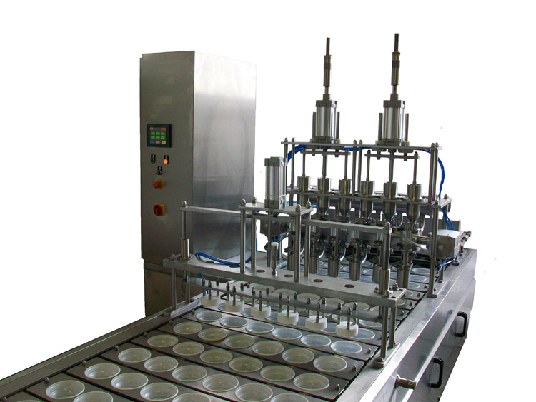 Fully automatic linear type cup filling and closing machines for filling a variety of different products into pre-made cups which may be of plastics, aluminium, carton, coex, tin or glass. The filling range extends from liquids to high viscosity, powdery products or products with particulates.